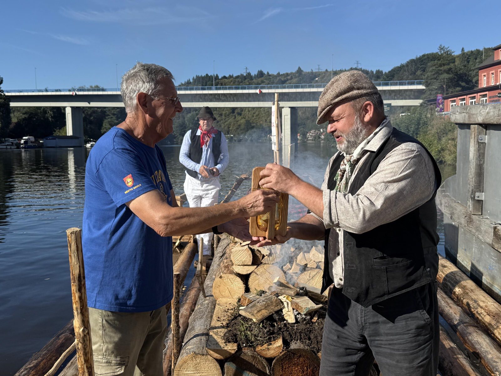 Na „Bohemce“ předal vrátný voru Jan Pöschl vodu z pramenů Vltavy předsedovi Vltavanu Praha Václavu Hodrovi, který ji druhý den v poledne svěřil do rukou Evy Pavlové.
